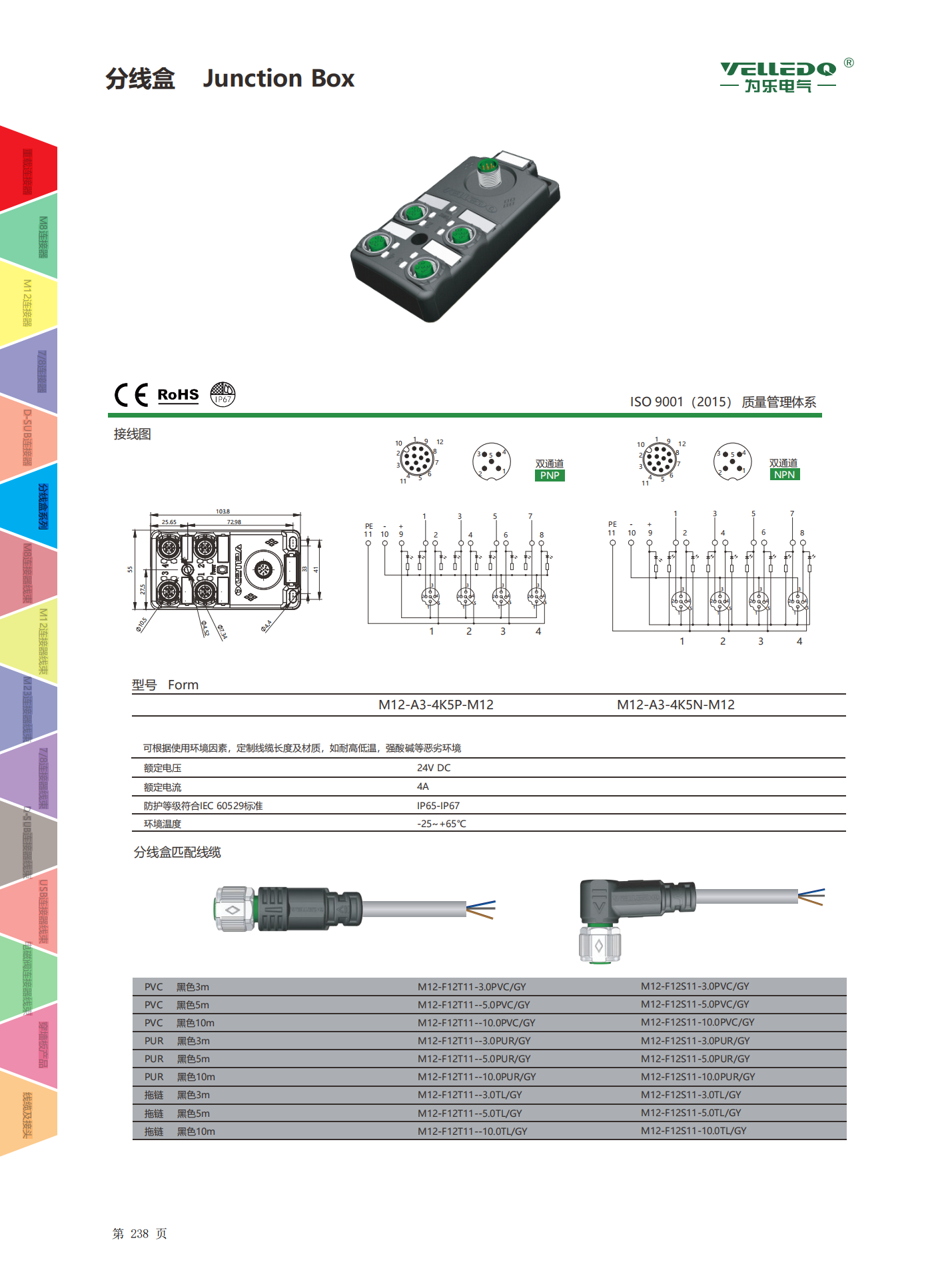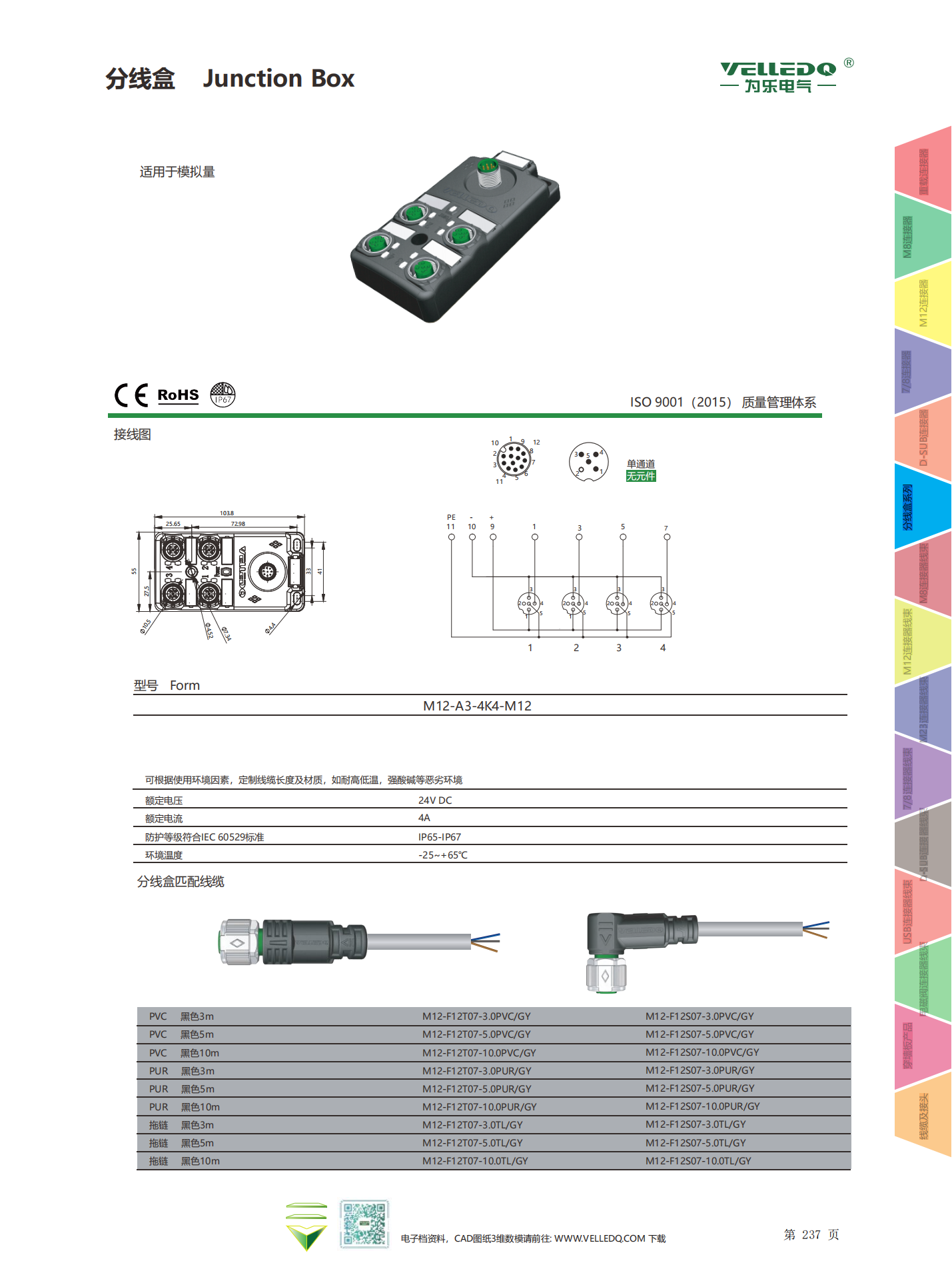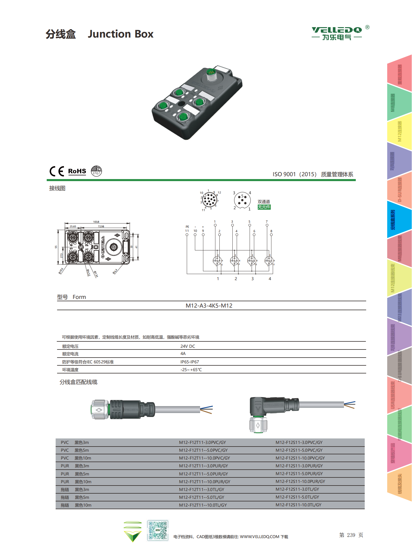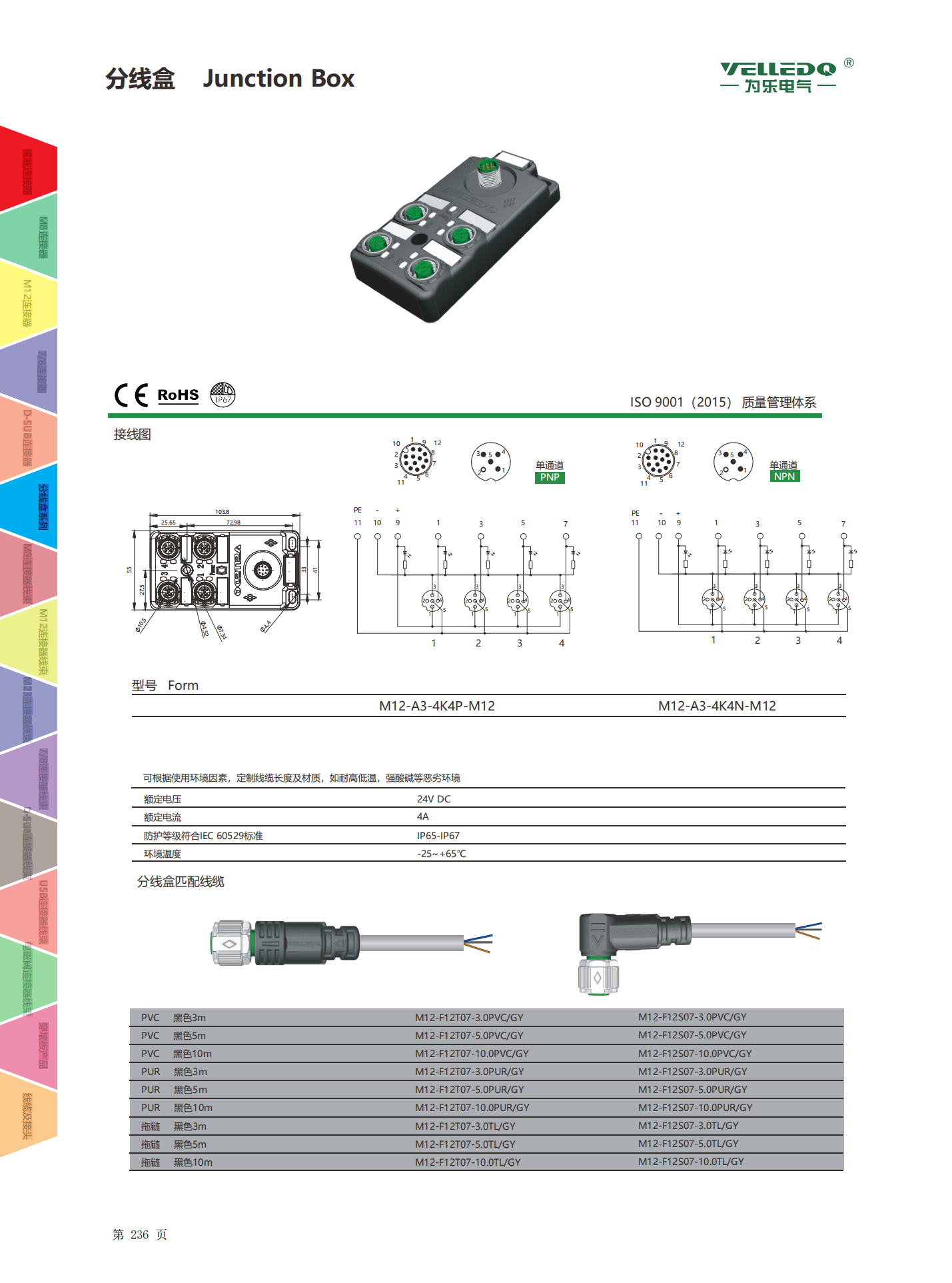M12带插头分配器,单通道双通道可选,线缆材质可选PVC,PUR,TL拖链,线缆长度可根据需求定制;