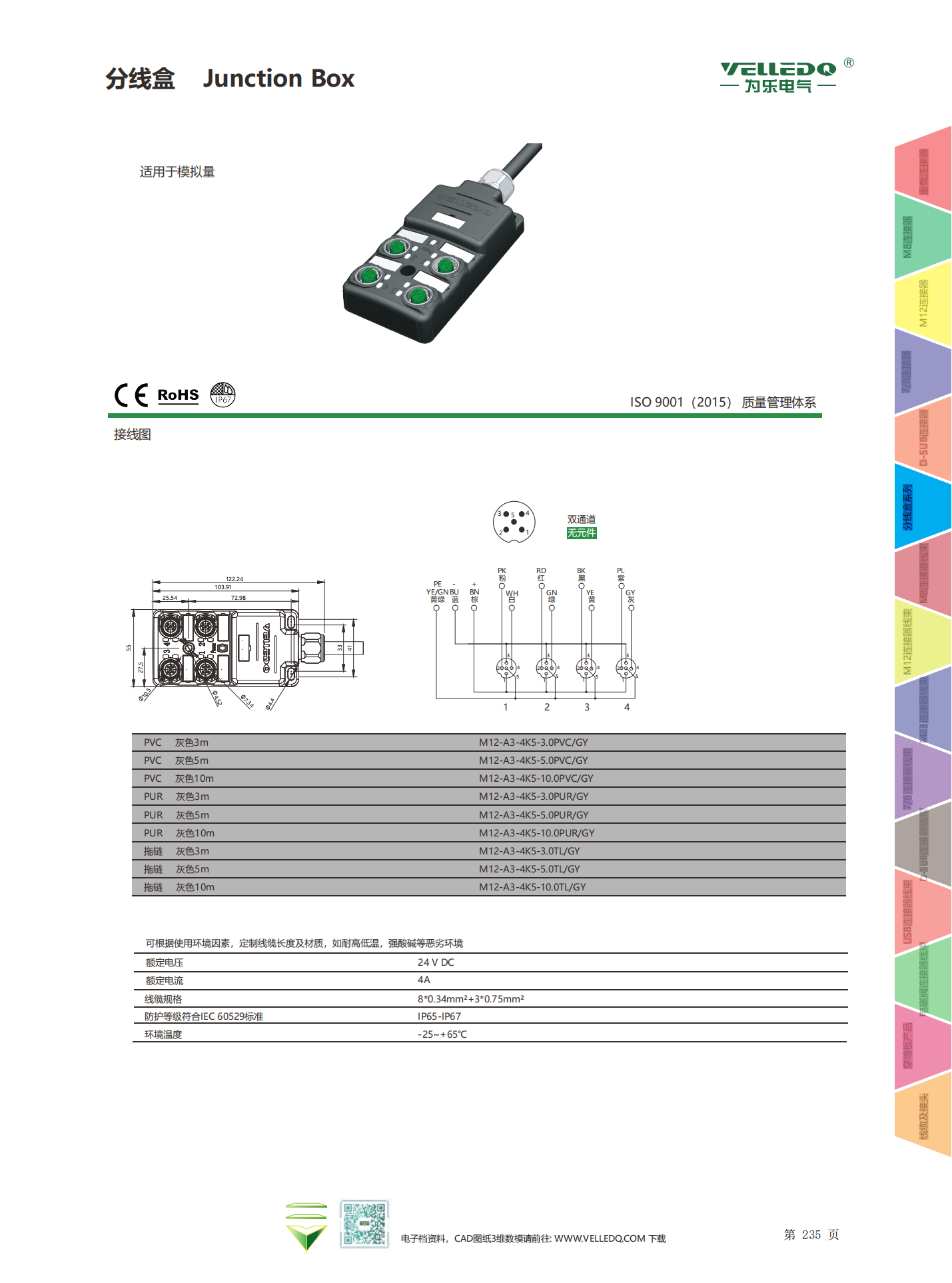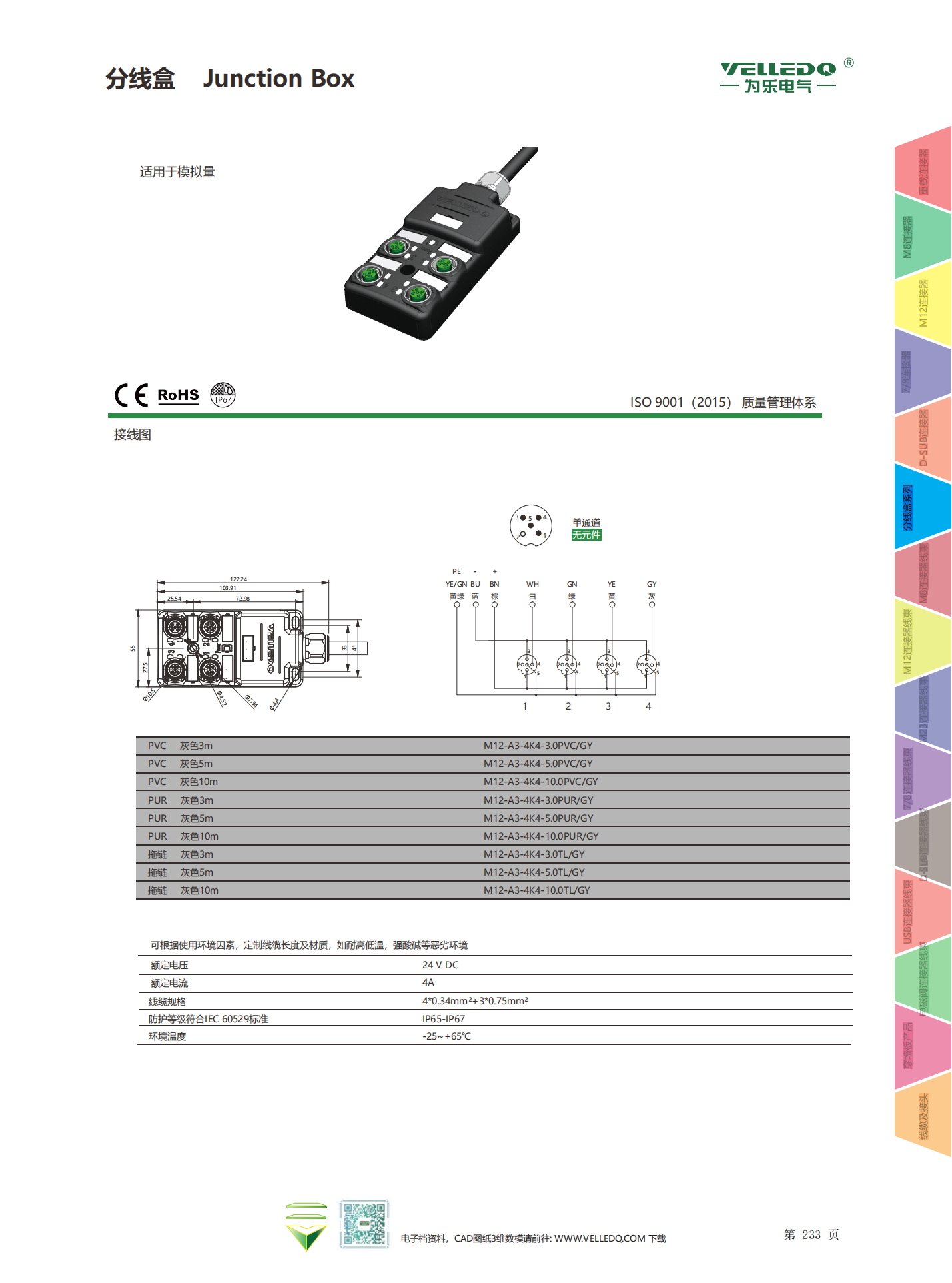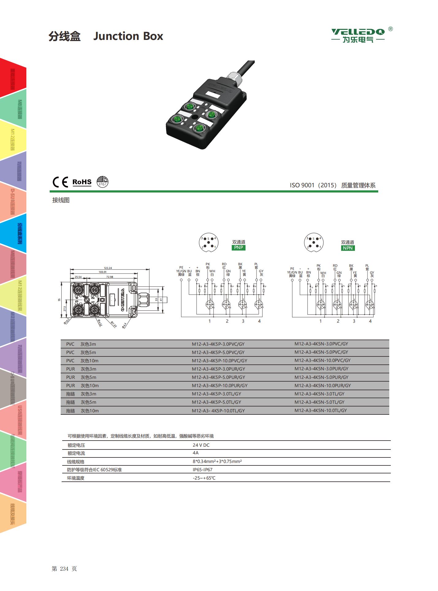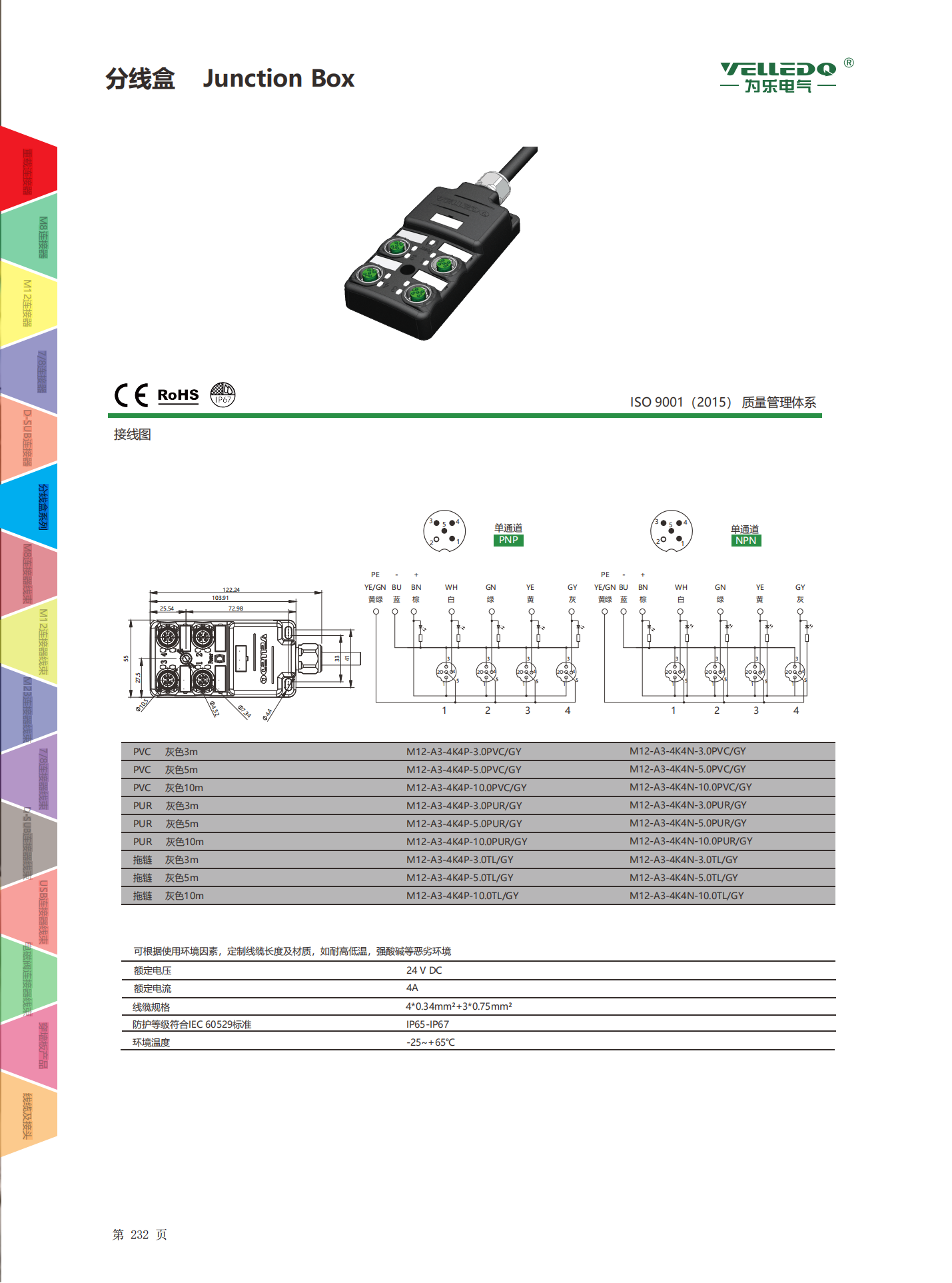 为乐电气VELLEDQ M12带线4口分线盒分配器PNP NPNM12-A3-4K4P-3.0PVC