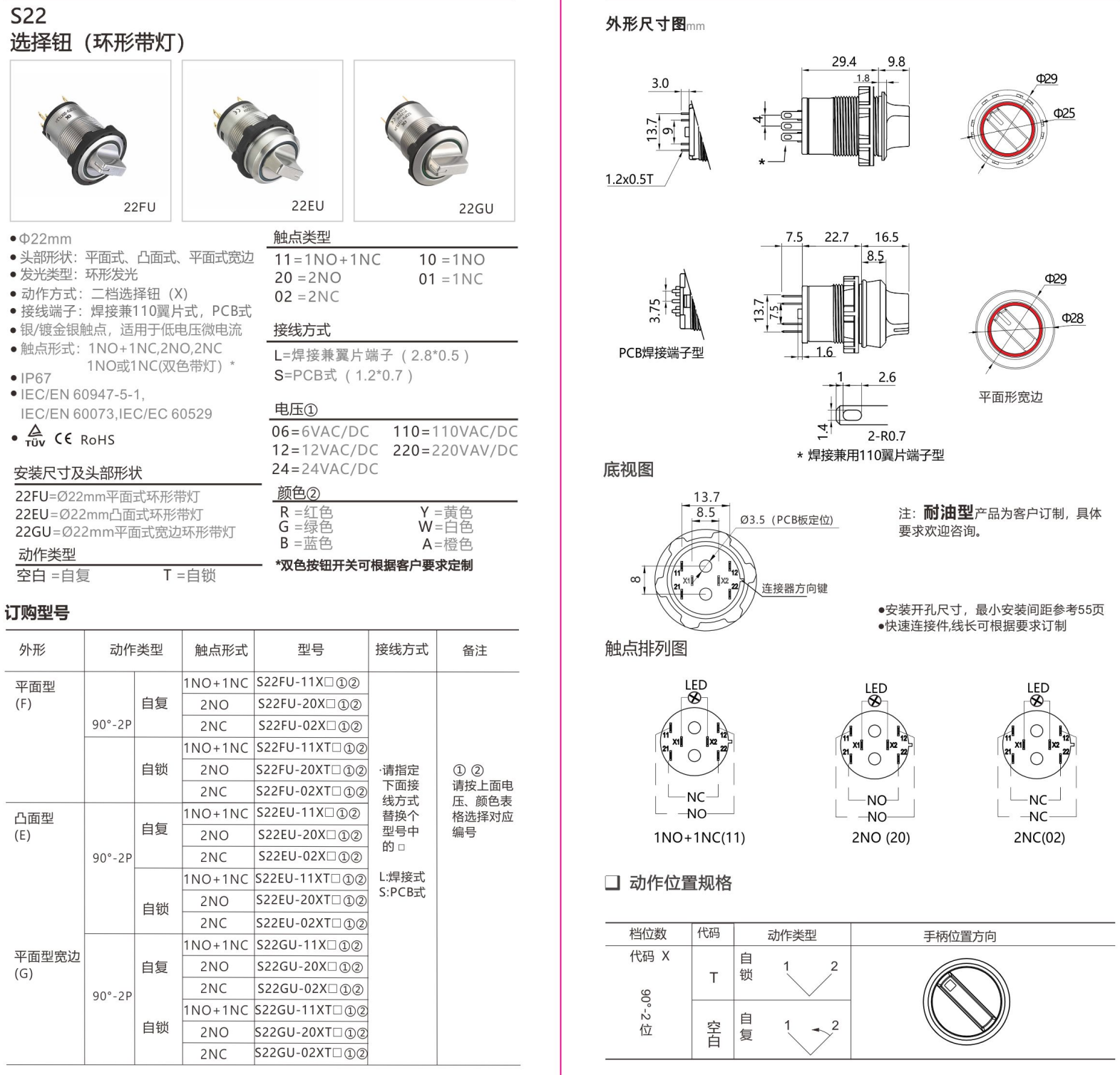 旋钮/钥匙钮:环形发光;紧急钮:圆点发光完整的产品线:按钮开关、选择开关、钥匙开关、紧急钮、指示灯蜂鸣器、USB插座、RJ45插座