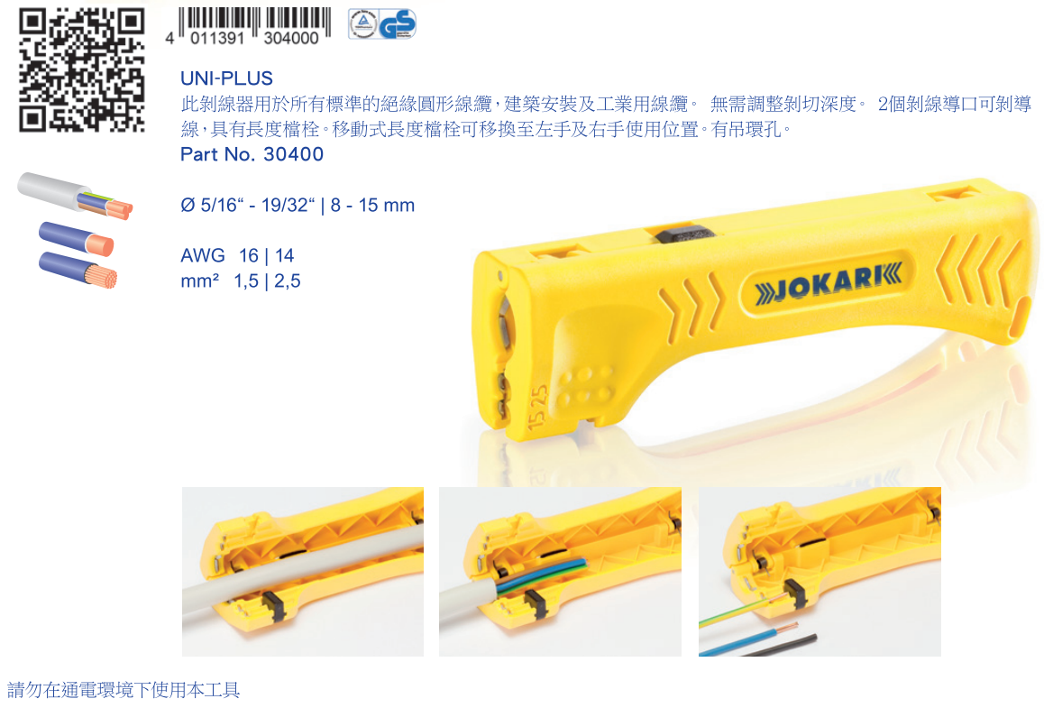 德国原装进口JOKARI剥线钳适用于剥离直径8到15mm的开缆刀30400