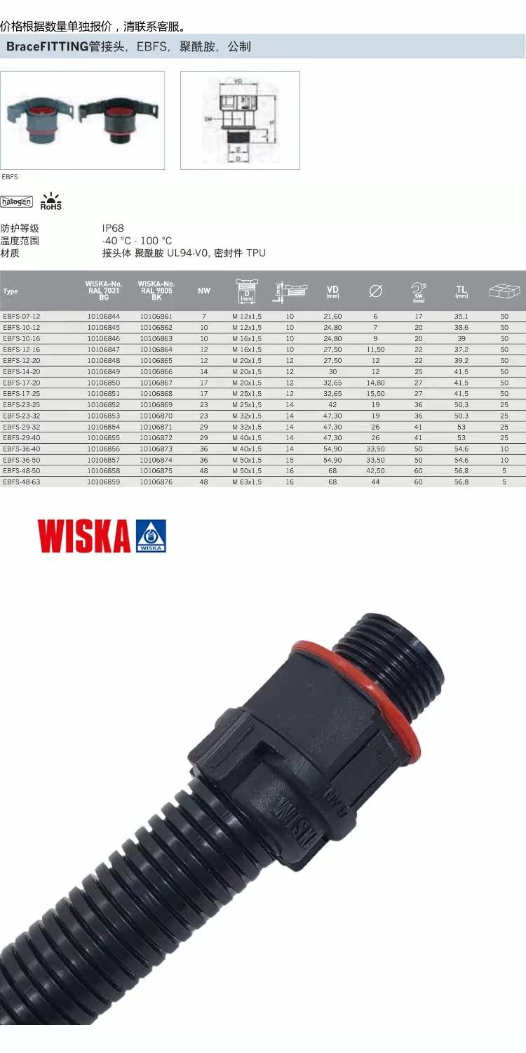 德国进口WISKA波纹尼龙软管接头NW管防水IP68抗拉EBFSM12532阻燃