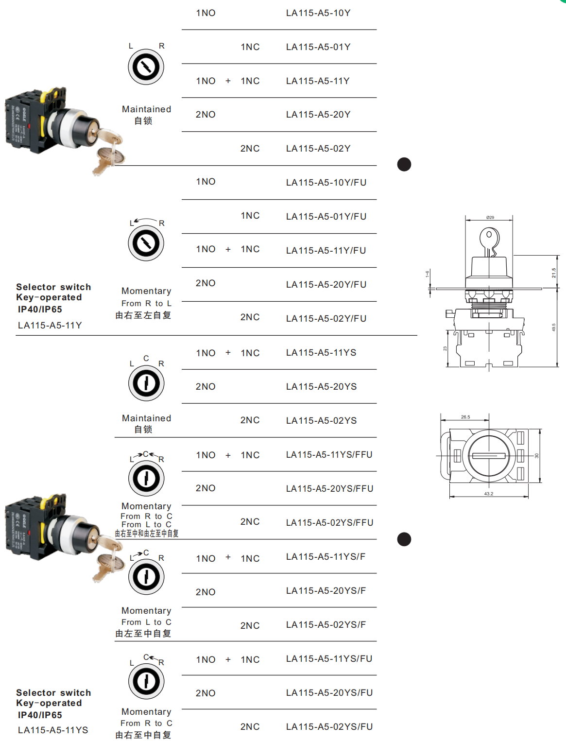 高桥电GQELE防水钥匙旋按钮22毫米LA115-A5-11Y一开一闭自锁复位