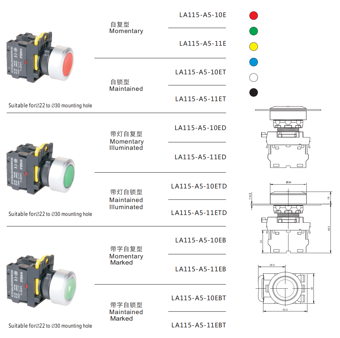 高桥GQELE22-30mm防水带灯自锁复位平头按钮一常开闭LA115-A511ED